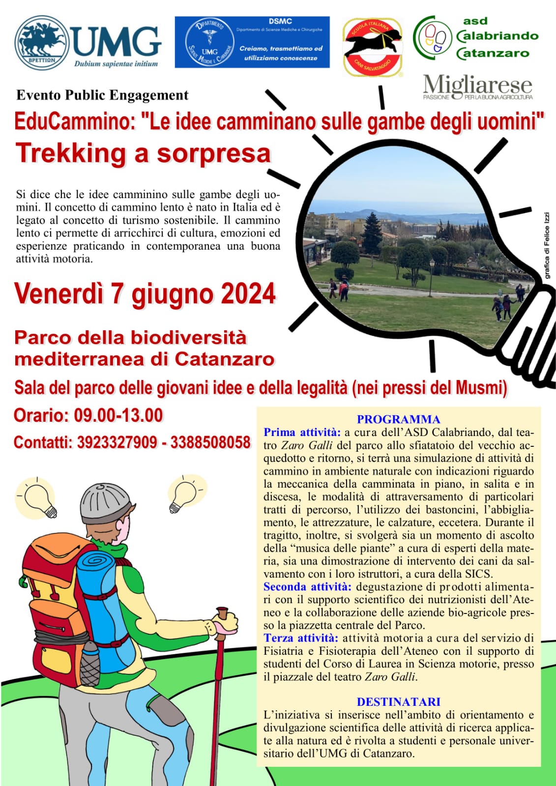 Venerdì 7 giugno al Parco della Biodiversità Mediterranea di Catanzaro si svolgerà l'evento "Edu-cammino: le idee camminano sulle gambe degli uomini. Trekking a sorpresa" patrocinato dal Dipartimento di Scienze Mediche e Chirurgiche dell’Università Magna Graecia.