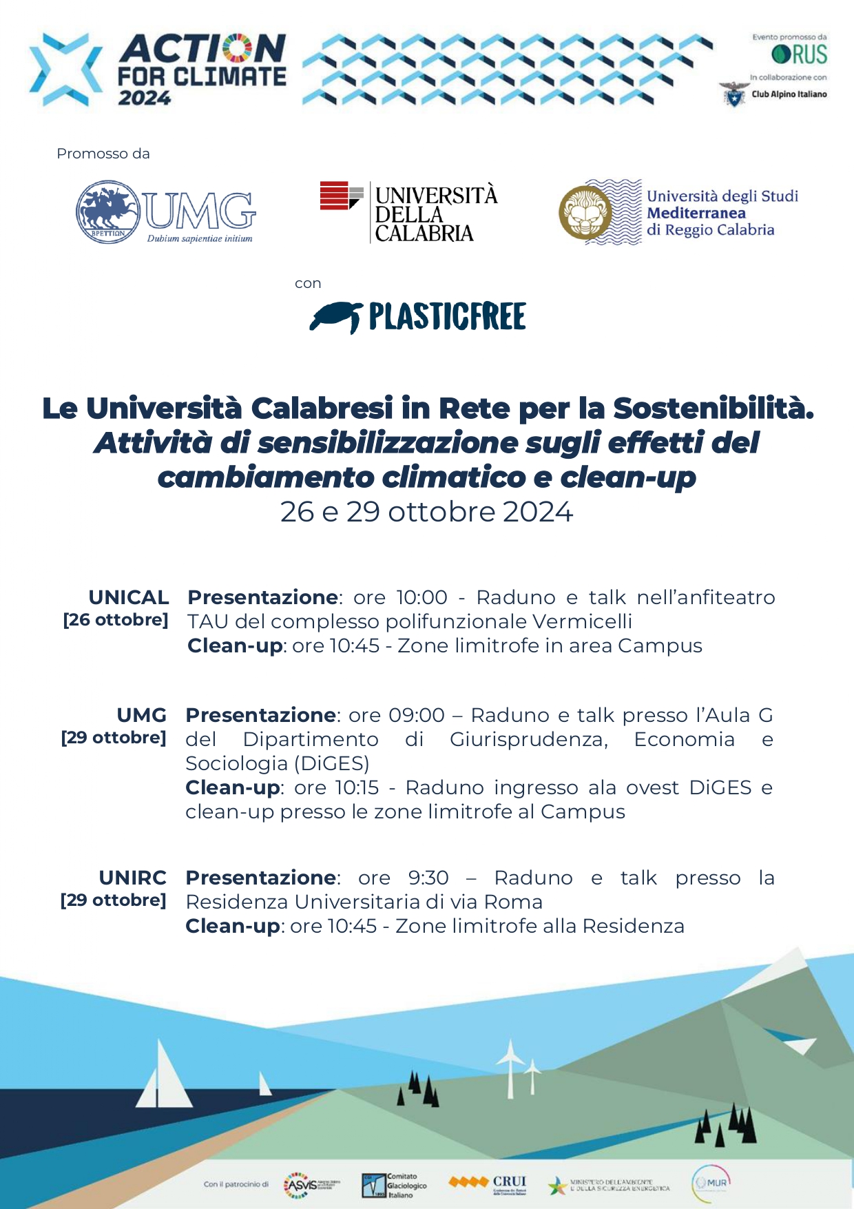 Continua l’attività di sensibilizzazione sulla sostenibilità dell’Università Magna Greacia di Catanzaro. Nuovo evento in programma il 29 ottobre nell’ambito del progetto “Action for climate”, patrocinato da RUS e realizzato in collaborazione con il Club Alpino Italiano.