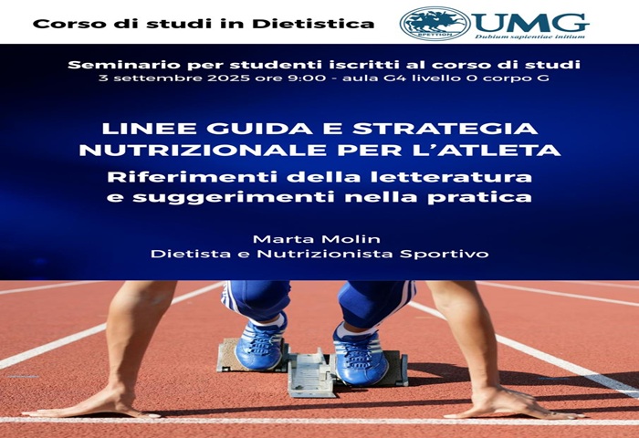 IL 3 SETTEMBRE ALLE ORE 09.00 PRESSO AULA G4 CORPO G SI SVOLGERA' IL SEMINARIO" LINEE GUIDA E STRATEGIA NUTRIZIONALE PER L'ATLETA" TENUTO DALLA D.SSA MARTA MOLIN, DIETISTA ESPERTA IN NUTRIZIONE NELLO SPORT,