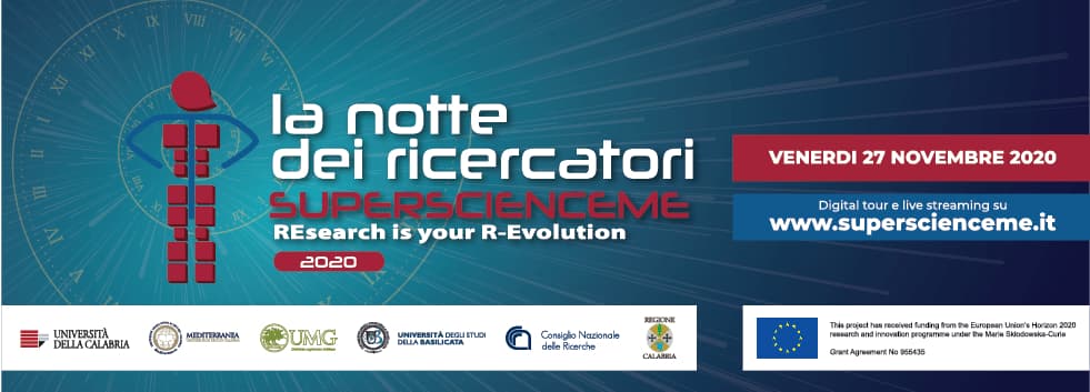 "SuperScienceMe - research is your R-Evolution", la Notte dei Ricercatori 2020 proposta alla UE, che l'ha finanziata, da Università della Calabria, Università di Catanzaro, Università di Reggio Calabria, Università della Basilicata, Regione Calabria e CNR, quest’anno è stata posticipata, come in tutta Europa e per via della pandemia, al 27 novembre.